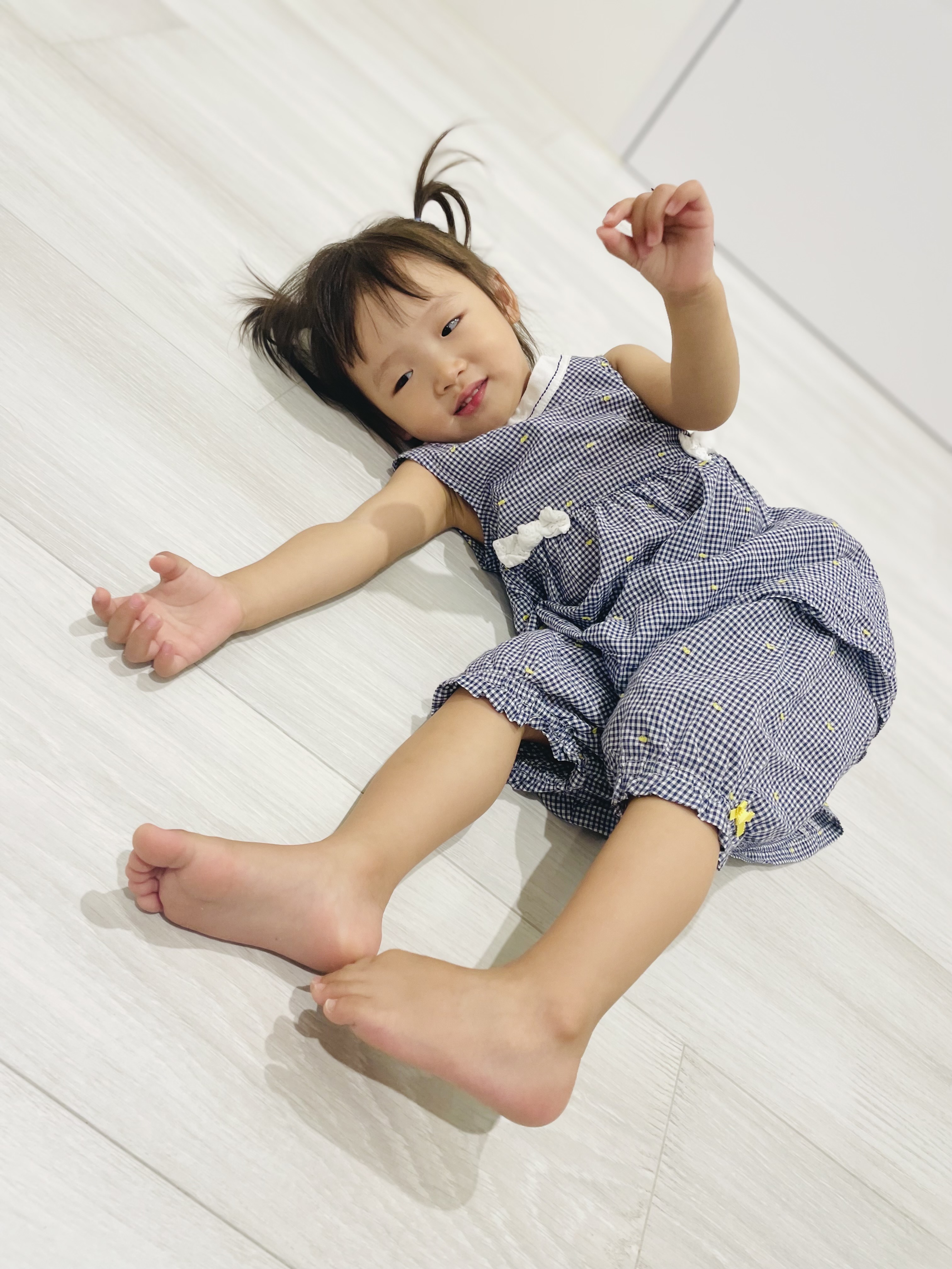 躺地寶塔莉覺得躺地板是享受,還會招呼媽媽一起躺。